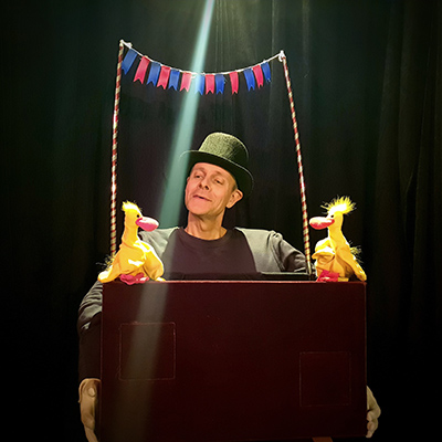 Menschen-Figurentheater an der Bauchladenbühne "Hier im Zirkus, hier im Zirkus Kunterbunt, hier im Zirkus hier im Zirkus geht es rund!" Singend begrüßt der Zirkusdirektor das Publikum. Sein Zirkus - eine Kiste - ist klein, sehr klein. Und weil der Zirkus so klein ist, muss der Direktor auch fast alles selber machen: